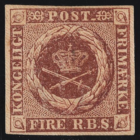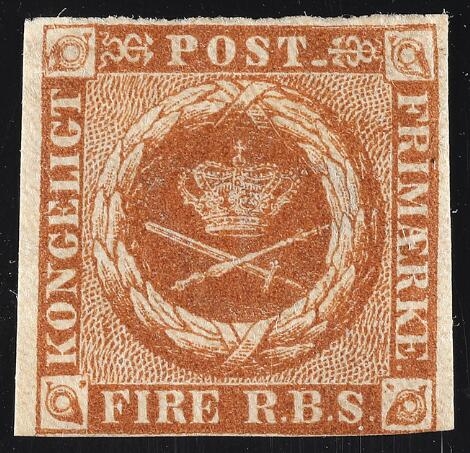 1854. 4 RBS Thiele III, gulbrun. Meget smukt ubrugt eksemplar med original gummi. Attest Møller "A very fresh copy in fine quality, flawless"