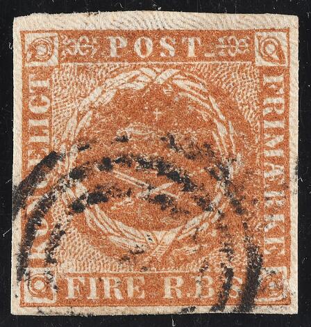 1851. 4 RBS Ferslew. Plade I. Pragteksemplar med glasklart stumt stempel