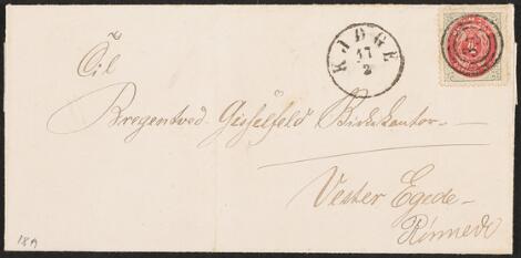 1870. 2 sk. Parstykke samt enkeltmærke på brev stemplet RANDERS 1/11 sendt til Lübeck. Enkeltmærke med få lidt afkortede takker.