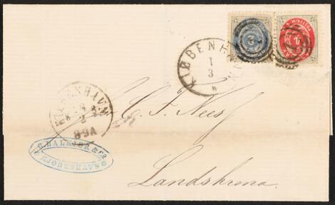 1870. 2 sk. grå/blå og 4 sk. grå/rød på brev fra København til Sverige 28.2.1871. 2 skillingsmærket er STÆRKT FEJLPERFORERET (usædvanlig lavt mærke)