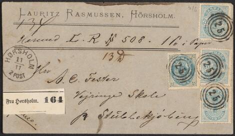 ca. 1882. 4 øre, Bicoloured issue and 4 copies 20 øre, Coat of ARms with small ciffers on parcelcover with in all 64 øre cancelled 25 and side handstamp HØRSHOL