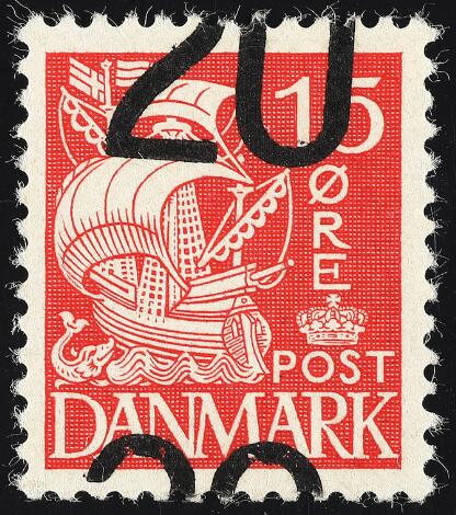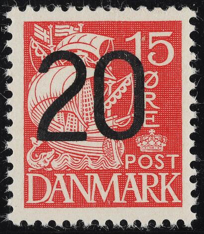 1940. 20/15 øre, rød. Mærke med STÆRKT FORSKUDT OVERTRYK fra "Tåstrup-arket" (Pos. 43)