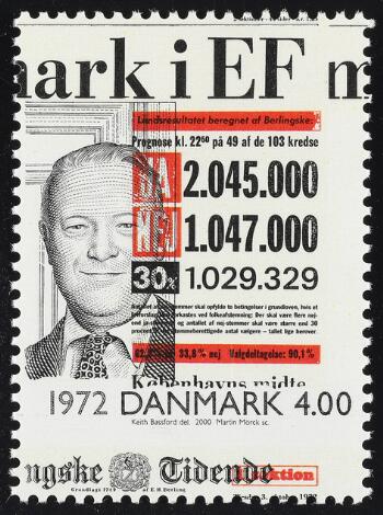 2000. 1900-tallet, 4 kr. flerfarvet. Variant "STÆRKT FORSKUDT TRYK" ("Berlingske Tidende" er nu nederst på mærket). Ganske få kendte. Postfrisk