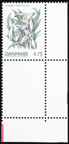 2006. Vintergæk, 4,75 kr. flerfarvet. Lodret parstykke "UDEN TRYK PÅ DET NEDRE MÆRKE". Meget sjældent. Kun få kendte