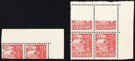 1933. Karavel, 15 Øre, rød, type IA. Øvre hjørne 4-blok med SAMMENKLÆBENDE PAPIRBANE. Mærkerne kendes kun i 20 eksemplarer, og er solgt fra posthuset i Rønde.