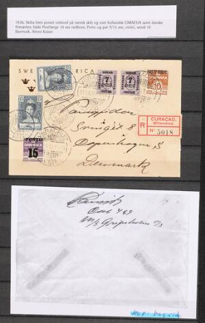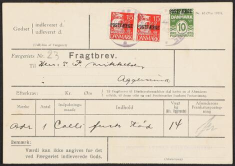 Postfærge. Lille samling fragtbreve mv. i indstiksbog med bl.a. spændende mix-frankering med attest Kasiser mv.
