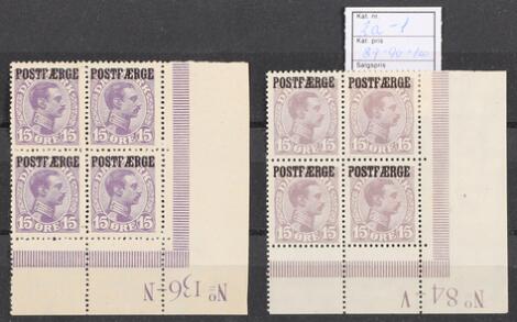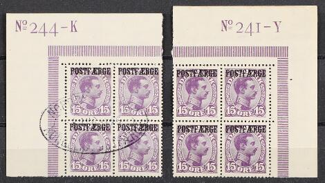1919. Chr. X, 15 øre. 2 marginalblokke med forskellige numre. 244-K stemplet og 241-Y postfrisk.