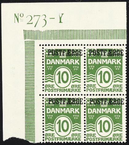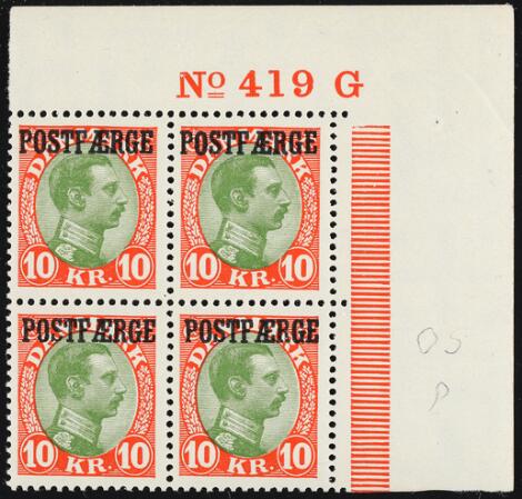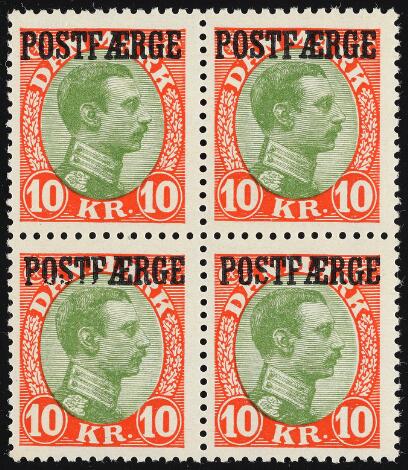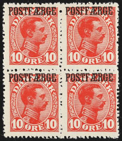 1919. Chr. X, 10 øre, variant "POSFFÆRGE". Postfrisk 4-blok med varianten i 2. mærke foroven. Nogle lette medfødte gummifolder.