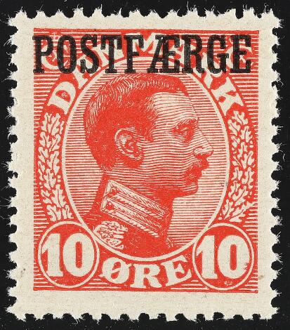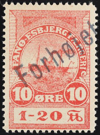 1910-1918. 10 øre, rød. Privat fremstillet FORLØBER (litografi) til postfærgemærkerne, anvendt ved Fanø-Esbjerg-Færgeri. violet overtryk "Forhøjet". Pæn ubrugt