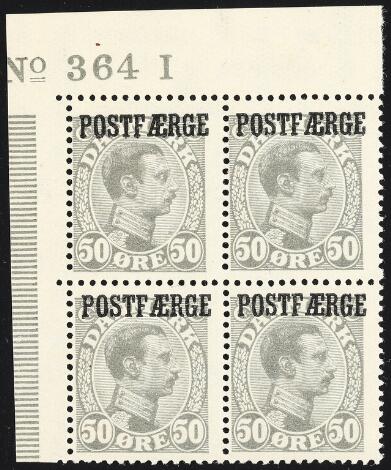 1922. Chr. X, 50 øre, grå. Postfrisk 4-blok med mrginalnummer 364-I.