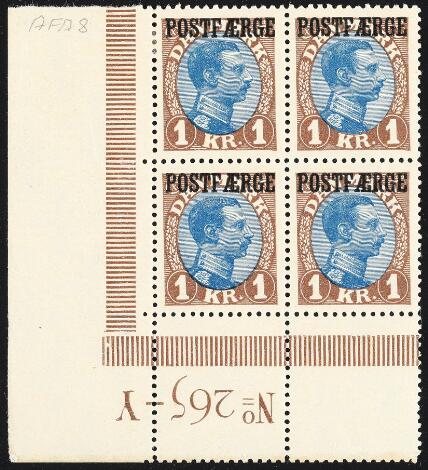 1924. Chr. X, 1 kr. Postfrisk 4-blok med marginalnummer 265-Y. (AFA 8000 kr.)