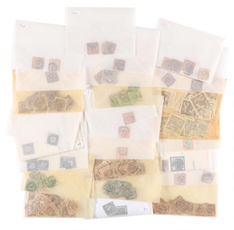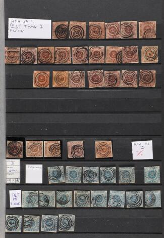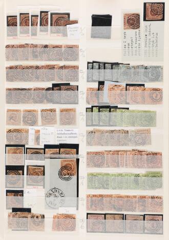 1864. Samling KRONE/SCEPTER/SVÆRD opsat med trykbestemte mærker, linietakkede, varianter og breve. Også ældre lagerparti 4 sk. rød med ca. 700