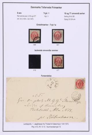 Danmark. Tofarvet 8 øre. Specialsamling med mange mærker opsat efter tryk i indstiksbøger og ringbind med mange fundne isolerede rammer, mange PERLEFEJL, set