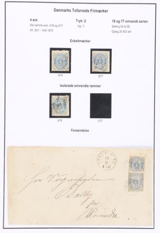 Tofarvet. Specialsamlig med mærker delt op i tryk med mange isolerede rammer, 4 øre, TYK ØST RAMME, Perlefejl osv. osv. Meget flot opsat. Bør ses!