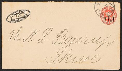 Perfin. J.M. Perfin on stationaryenvelope 8 øre (J. Moresco).