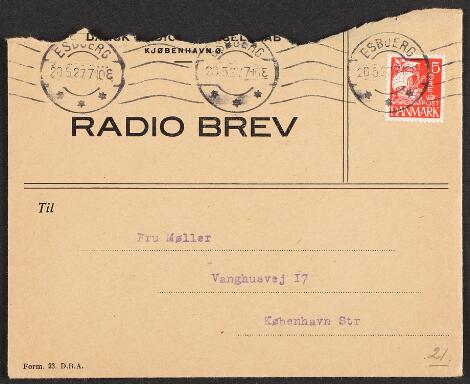 Radio letter 1927 from Dansk Radio Aktieselskab sent from "ESBJERG 20.5.1927" to Copenhagen with full content. Unusual with Radio letter postmarked in Esbjerg.