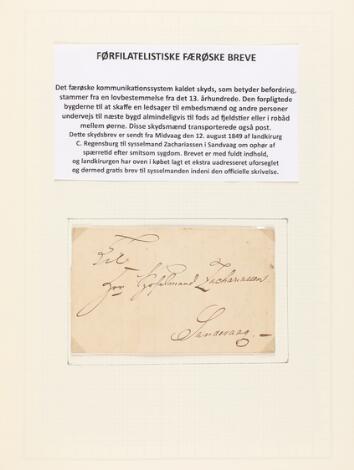 Færøerne. 1849-1945. Velbesat samling i Leuchtturmalbum. Indeholder bl.a. sjældent brev fra Midvaag til Sandevaag i 1849 med fuldt indhold, brev fra Tveraa 1858