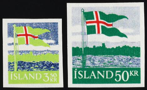 1958. Flag, 3,50 kr. og 50 kr. 2 stk. utakkede PRØVETRYK i rød/grøn/blå. Tykt gummieret papir