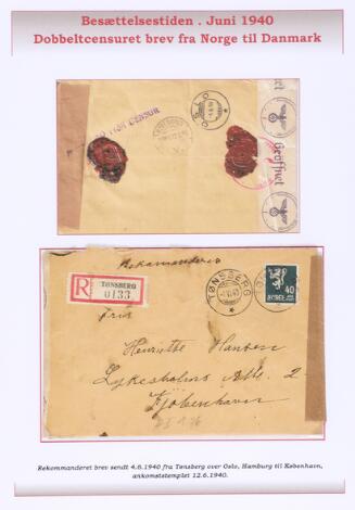 1940. Lion, 40 øre, blue on double censored REC-cover from Tønsberg 4.VI40 to Denmark. Line-canc. ÅBNET VED TYSK CENSUR