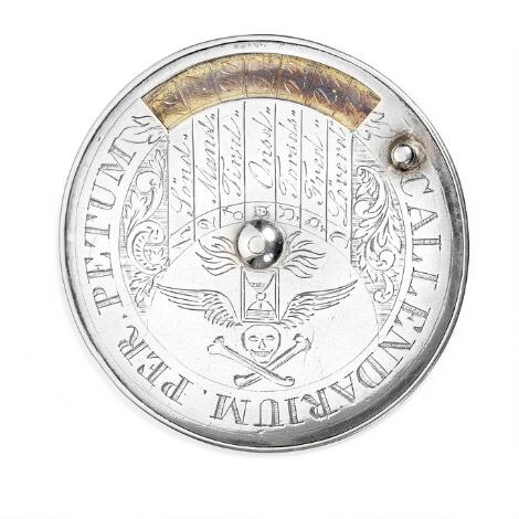 Evighedskalender af sølv med bl.a. dato samt solens op- og nedgang. Antagelig Nederlandene. 18. årh. Diam. 5,2 cm.