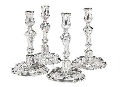 Et sæt på fire danske rokoko stager af sølv. Mester Sivert Thorsteinsson 1758, Københavns 1759. H. 20 cm. (4)