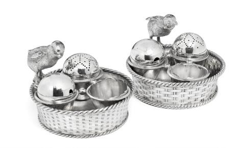 To danske usædvanlige æggebægre-sæt af sølv. A. Michelsen, København 1887 og 1891. Vægt 944 g. H. 8,5 cm. (2)