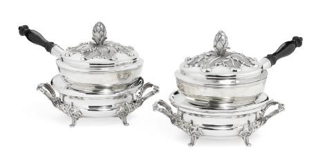 Et par kasseroller af sølv, Ferdinand Dahl, Kbh. 1853. Og et par varmestande af pletsølv. Christofle 1844-1862. (8)