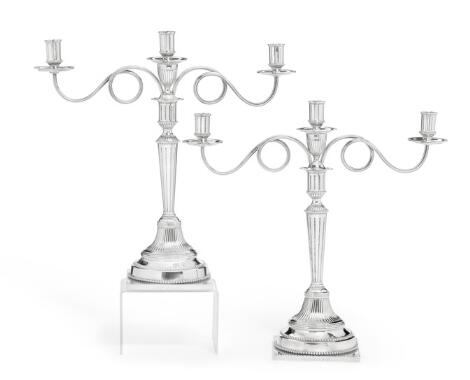 Et par danske Louis XVI tre-armede kandelabre af sølv. Mester Jørgen Friis, borgerskab i Randers 1774. H. 40 cm. (2)