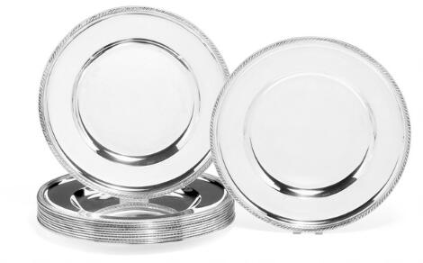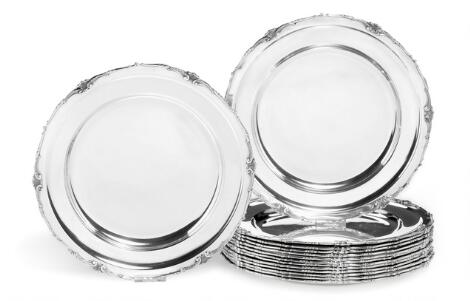 Et sæt på 12 dækketallerkener af sterling sølv. A. Michelsen, København 1966. Vægt 5.800 g. Diam. 27,5 cm. (12)