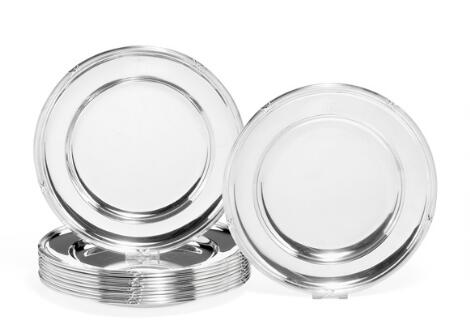 12 tyske tallerkener af sølv med monogram for slægten Ahlefeldt-Laurvig. 1960'erne. Diam. 25 cm. (12).