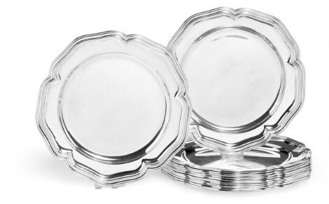 Et sæt på 14 dækketallerkener af sølv. H. Villads-Nielsen, København 1946 og 1950. Vægt 7.511 g. Diam. 29 cm. (14)