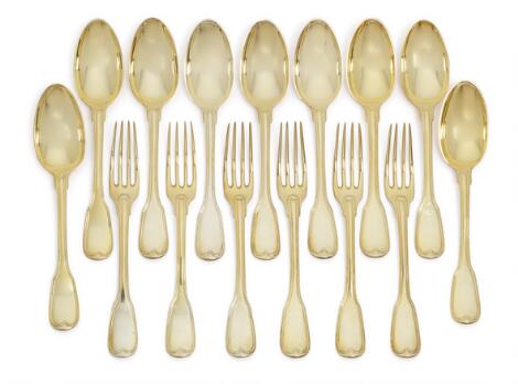 Tysk dessertbestik af forgyldt sølv, 15 dele. Abraham Warnberg IV, Augsburg 1779-1781. L. 18 cm./18,5 cm. (15).