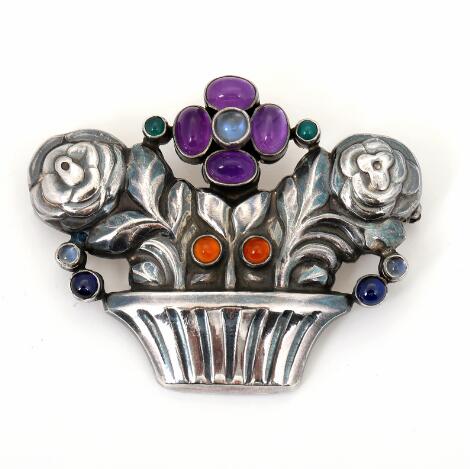 2549/1286Georg Jensen: A brooch in the shape of a flower basket set with amethyst a.o, mounted in sterling silver.