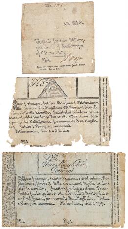 2549/53615 Rigsdaler Courant 1799, Sieg 40, Pick A29b, 1 Rigsdaler Courant 1802, Sieg 39, Pick A28, 12 skilling 1809, Sieg 45, Pick A41, in total 3 pcs