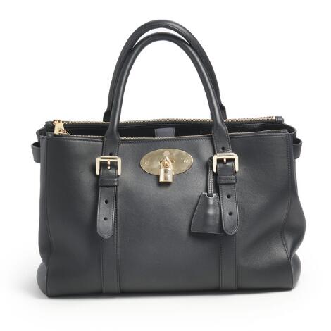2548/1342LyngbyMulberry: A "Bayswater Double Zip" bag of black leather with gold tone hardware and two adjustable handles.