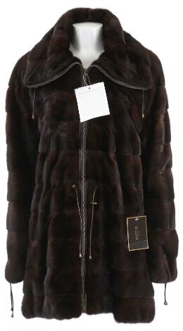 2547/9015LyngbyLevinsky: A long dark brown jacket of mink with a collar and button and clasp closure on front. L. 122 cm.