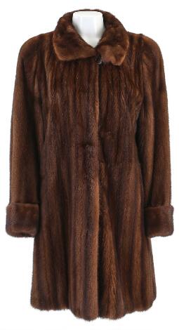 2547/9016AarhusA dark brown Saga mink coat with small collar, clasp closure and two pockets. Sleeve L. app. 70 cm. L. 125 cm.