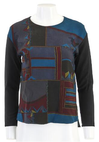 2548/1337LyngbyEtro: A long sleeved silk blouse with burgundy and dark blue print and a button closure at the back. Size 42.