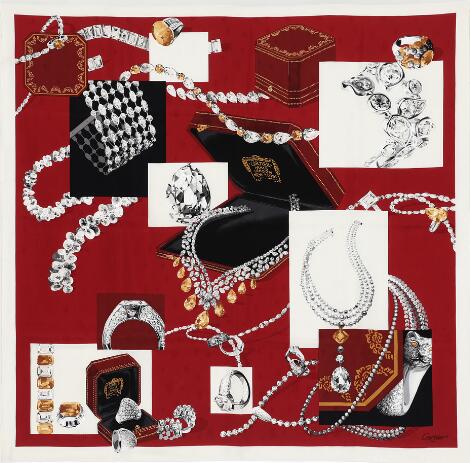 2548/1338LyngbyCartier: A silk scarf with jewellery motif in grey, golden and red colours. App. 86 x 86 cm.