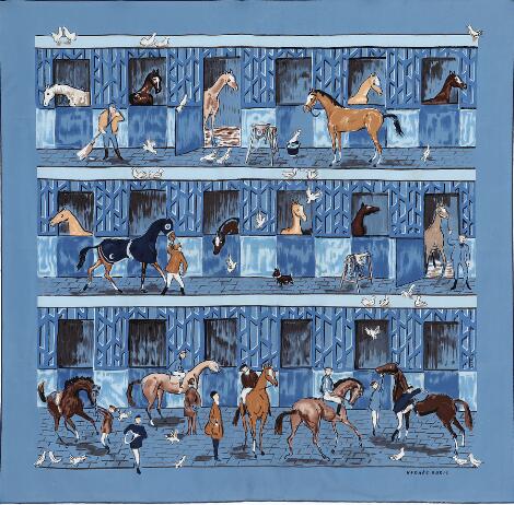 2548/1334LyngbyHermès: A silk scarf with motif "Les Boxes" by Jean Louis Clerc in blue and brown colours. App. 89 x 89 cm.