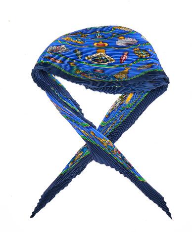 2548/1336LyngbyHermès: A pleated silk scarf with blue, green and golden motif. L. app. 130 cm.