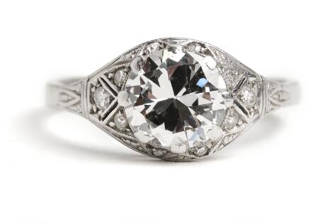 2545/1114Diamantring af platin prydet med old European-cut diamant på ca. 1.90 ct. flankeret af diamanter. Str. 56,5.