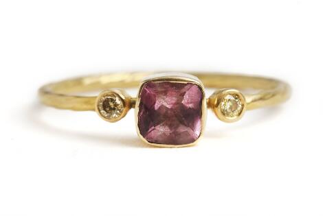 2545/1145Natascha Trolle: Turmalinring af 18 kt. guld prydet med cushion-cut turmalin og to gule diamanter. Str. 53.