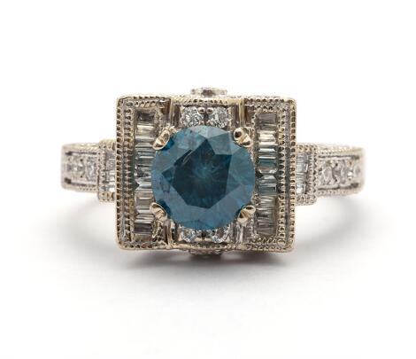 2545/1119Diamantring af 14 kt. hvidguld prydet med farvebehandlet blå diamant og talrige diamanter. Str. 53.