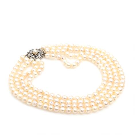 Viggo Wollny: Fire-radet perlekæde prydet med talrige perler monteret med lås af 18 kt. hvidguld. L. 41-45 cm.