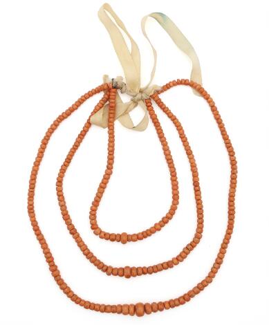 Tre-radet koral halskæde i forløb prydet med talrige koral perler med bindebånd til nakken. L. ca. 100 cm.