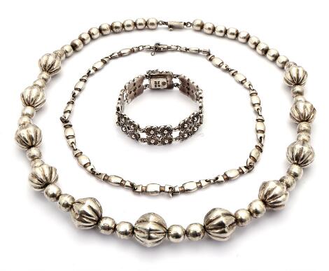 Mexicansk smykkesamling af sølv bestående af armbånd og to halskæder. L. 18,7-65 cm. (3)