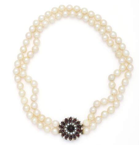 To-radet perlehalskæde prydet med talrige perler og lås af metal prydet med talrige granater. L. 43 cm.