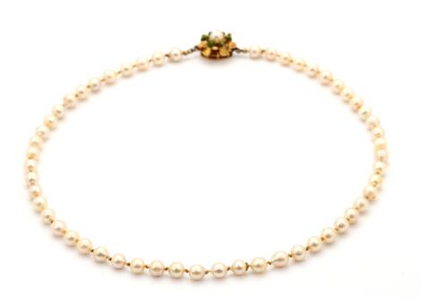 Perlehalskæde prydet med talrige perler og kuglelås af 14 kt. guld. Perlediam. ca. 6 mm. L. 41 cm.