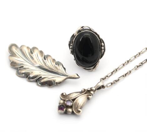 Georg Jensen m.fl.: Smykkesamling af sølv bestående af ring, broche og vedhæng med halskæde. Str. 53. (4)